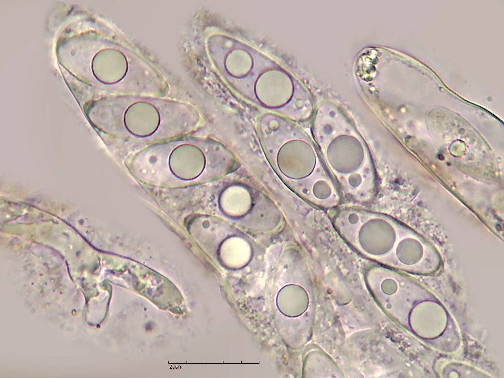 Sorprende, no obstante, la inmadurez del himenio dado su considerable tamaño (12 cm de diámetro en la grande), pero he podido ver alguna de sus ascas con esporas maduras.