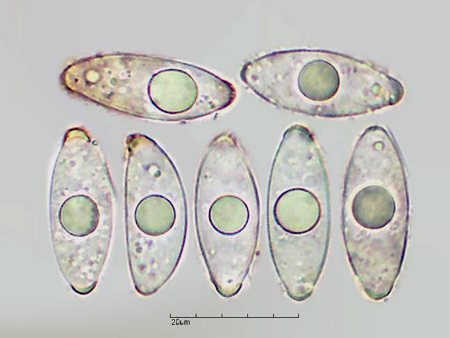 Fácil de reconocer por su tamaño, colorido y forma de la mitra (sombrero), se distingue también al microscopio por sus estrechas ascosporas subfusiformes, con una gútula central principalmente y con apéndices en los polos de éstas.