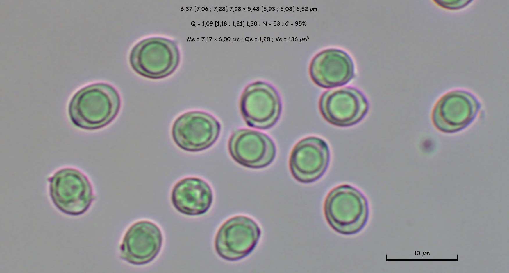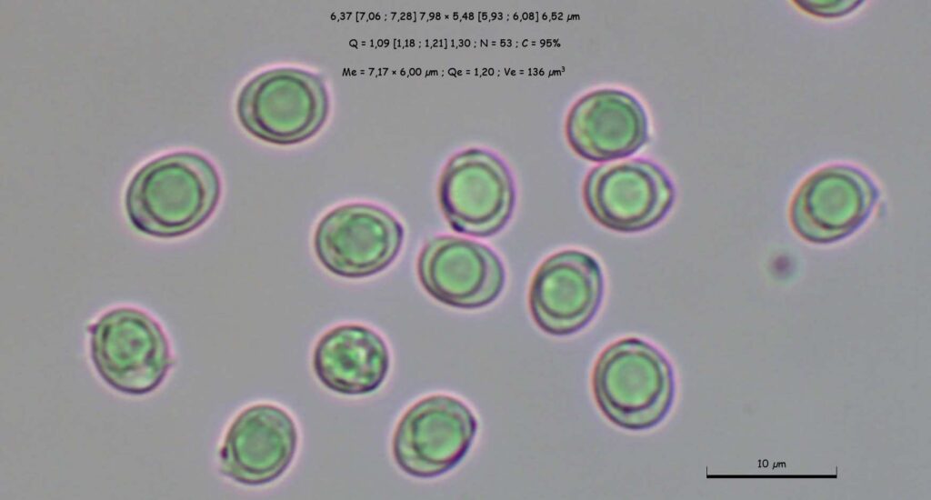 Basidiosporas de subglobosas a anchamente elipsoidales con gútula interior. (1000X)
