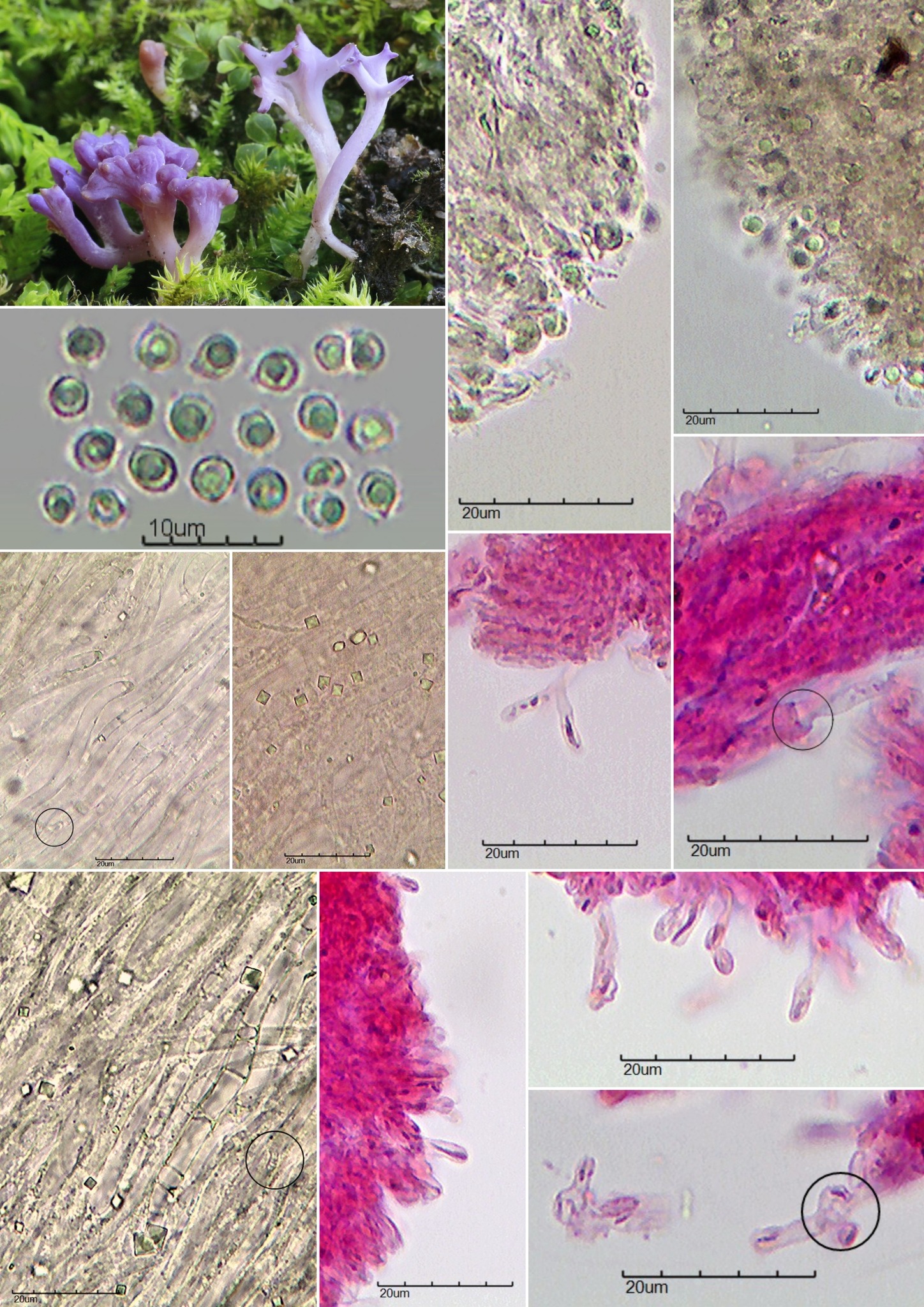 Fue trasladado a su género actual por Edred John Henry Corner en 1950. Un llamativo hongo parecido al coral que es de color lila vibrante cuando está fresco pero que pronto se desvanece a colores más sutiles, la parte basal es blanca. Crece hasta no más de 4 cm de altura y está escasamente ramificado. Se encuentra en suelos con musgos y pastos.(traducido parcialmente de la página https://www.outerhebridesfungi.co.uk/species.php?id=550). Ficha elaborada por Antonio Ezquerro del grupo Verpa de Logroño.