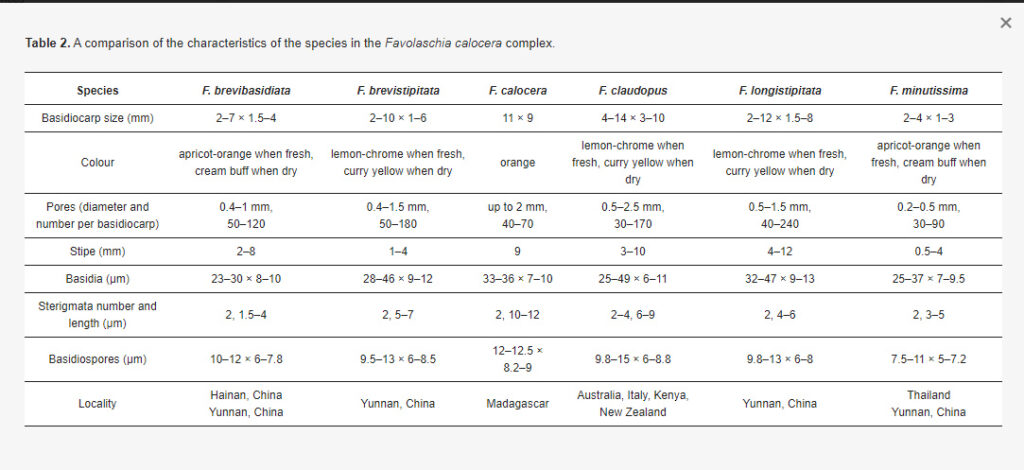 Os pongo un trabajo reciente de Qiu-Yue Zhang and Yu-Cheng Dai sobre «Taxonomy and Phylogeny of the Favolaschia calocera Complex
