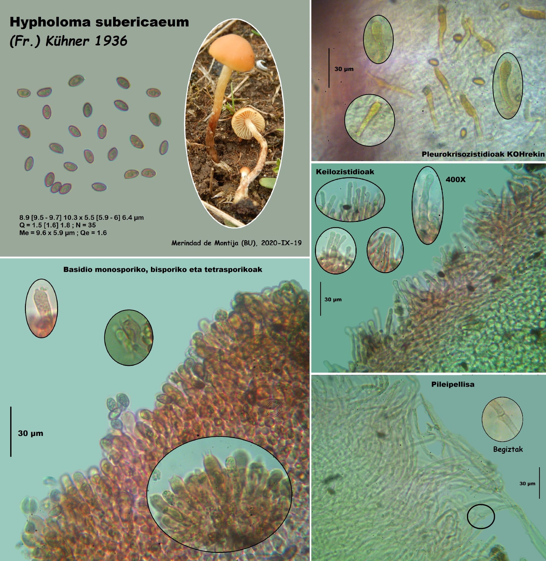 Su microscopía se distingue fundamentalmente por la posesión de esporas pequeñas con una largura media inferior a 9/10 micras y anchura media inferior a 5/6. Leptocistidios de la arista (cistidios lisos sin contenido granular) cilíndricos, lageniformes con el ápice a veces subcapitado. Pleurocrisocistidios ( cistidios de la cara laminar con contenido granular dorado con KOH ) normalmente clavados, a veces mucronados.